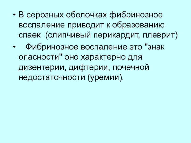 Фибринозное воспаление это "знак опасности" оно характерно для дизентерии, дифтерии, почечной недостаточности (уремии).