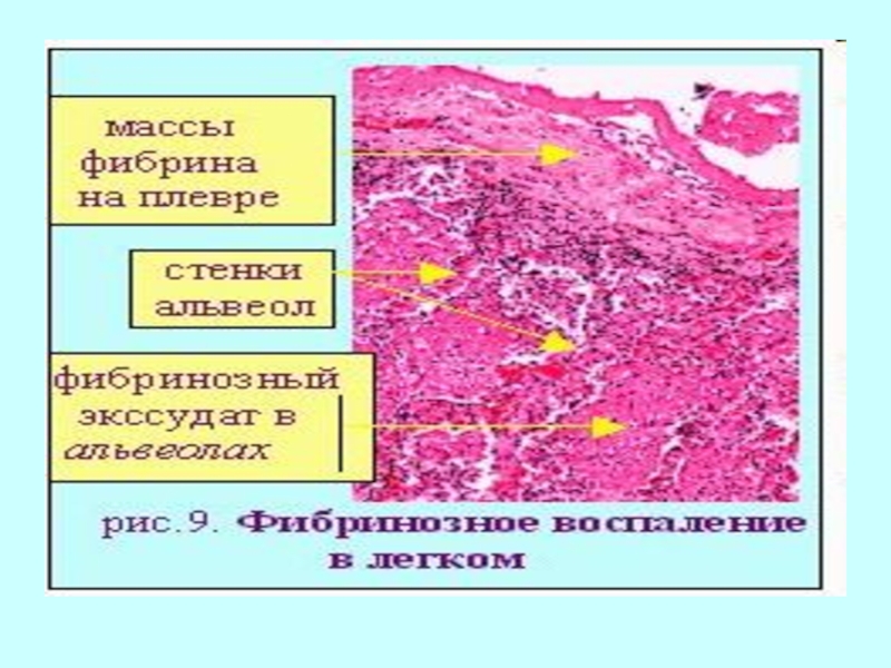 и фибринозное воспаление Чаще всего оно вызывается возбудителями дифтерии, дизентерии, туберкулеза; эндо- токсинами (при уремии); экзотоксинами (отравление сулемой). В зоне погибших тканей образуется фибрин. Если фибринозное воспаление захватывает большие участки легких (доли), то возникает пневмония с дыхательной недостаточностью