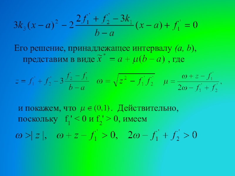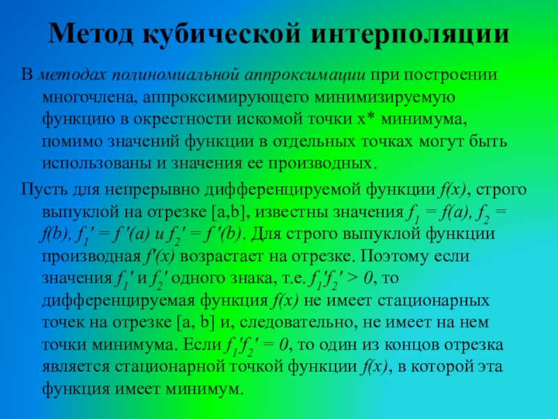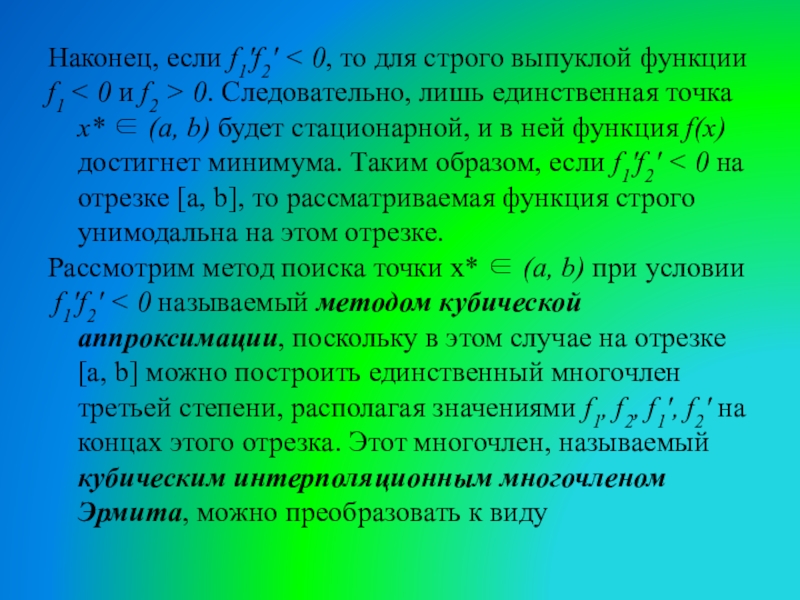 f1'f2' < 0 называемый методом кубической аппроксимации, поскольку в этом случае на отрезке [a, b] можно построить единственный многочлен третьей степени, располагая значениями f1, f2, f1', f2' на концах этого отрезка. Этот многочлен, называемый кубическим интерполяционным многочленом Эрмита, можно преобразовать к виду