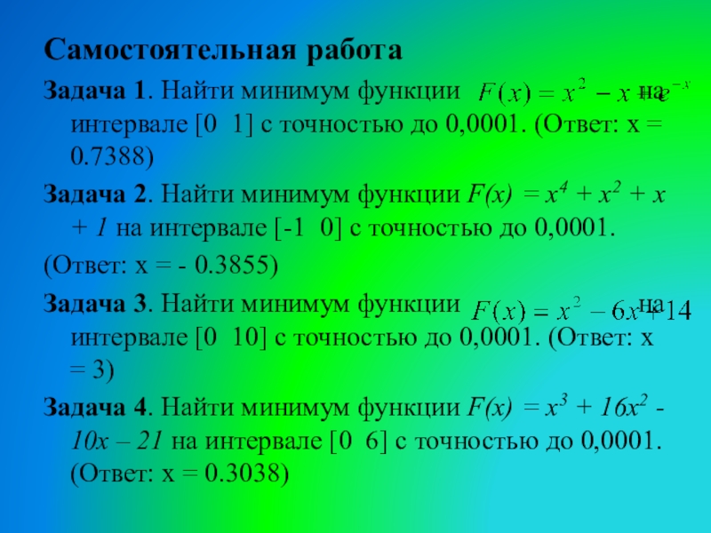 Задача 2. Найти минимум функции F(x) = x4 + х2 + x + 1 на интервале [-1 0] с точностью до 0,0001.