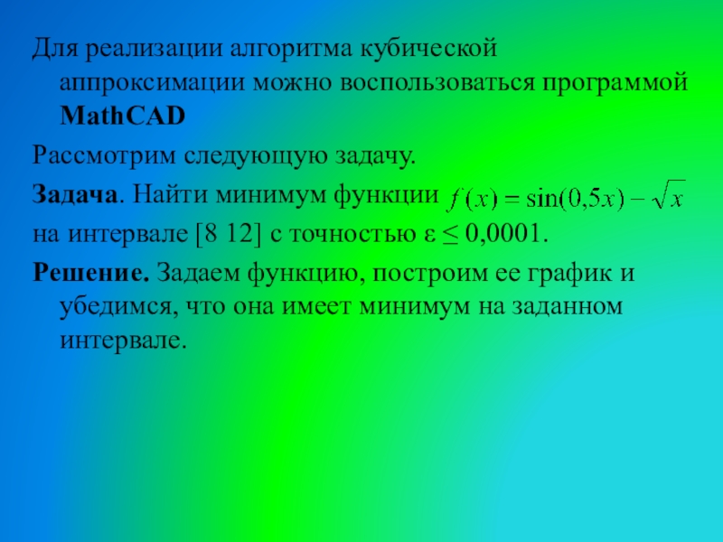 Слайд 9Для реализации алгоритма кубической аппроксимации можно воспользоваться программой MathCAD