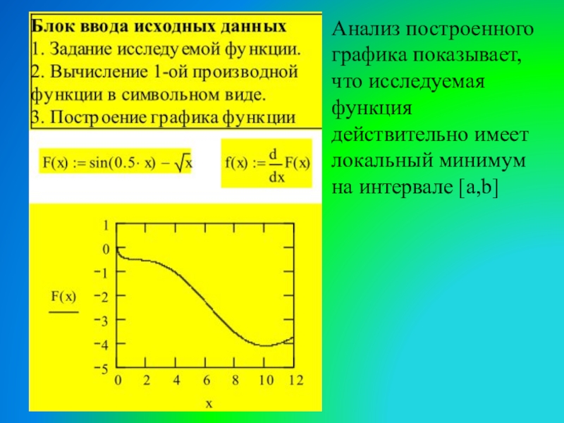 Слайд 10Анализ построенного графика показывает, что исследуемая функция действительно имеет локальный минимум