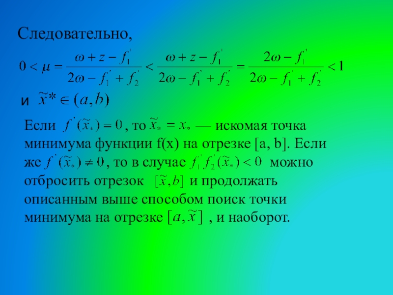— искомая точка минимума функции f(x) на отрезке [a, b]. Если же , то в случае можно отбросить отрезок и продолжать описанным выше способом поиск точки минимума на отрезке , и наоборот.