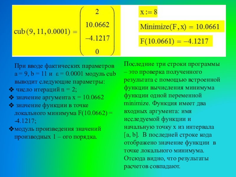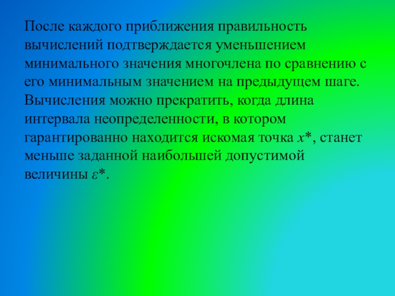 Слайд 8После каждого приближения правильность вычислений подтверждается уменьшением минимального значения многочлена по