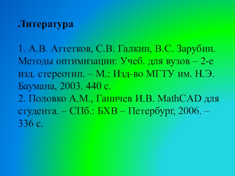 1. А.В. Аттетков, С.В. Галкин, В.С. Зарубин. Методы оптимизации: Учеб. для