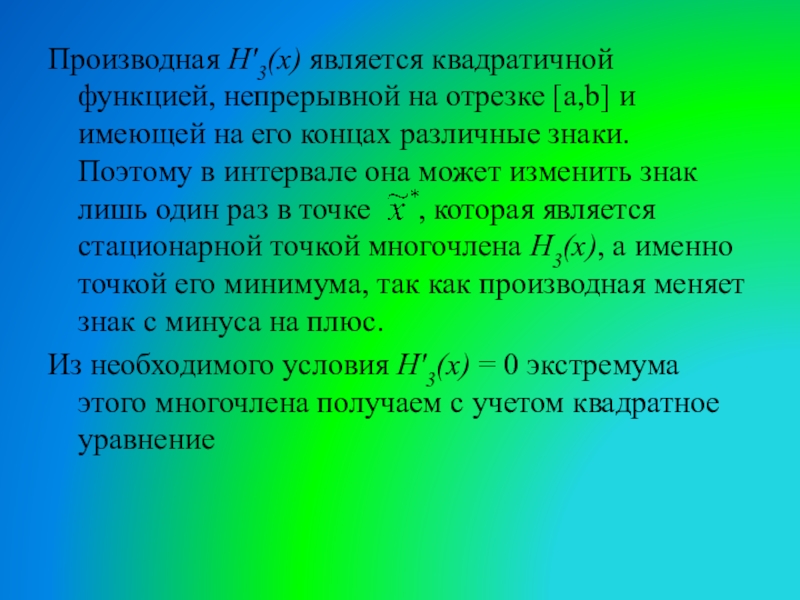 Слайд 5Производная Н'3(х) является квадратичной функцией, непрерывной на отрезке [a,b] и имеющей
