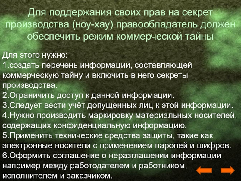1.создать перечень информации, составляющей коммерческую тайну и включить в него секреты производства.