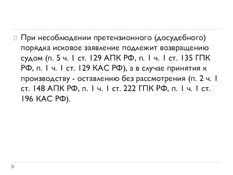 Слайд 13При несоблюдении претензионного (досудебного) порядка исковое заявление подлежит возвращению судом (п.