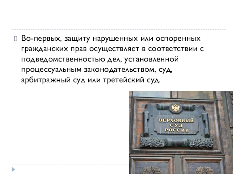 Слайд 7Во-первых, защиту нарушенных или оспоренных гражданских прав осуществляет в соответствии с