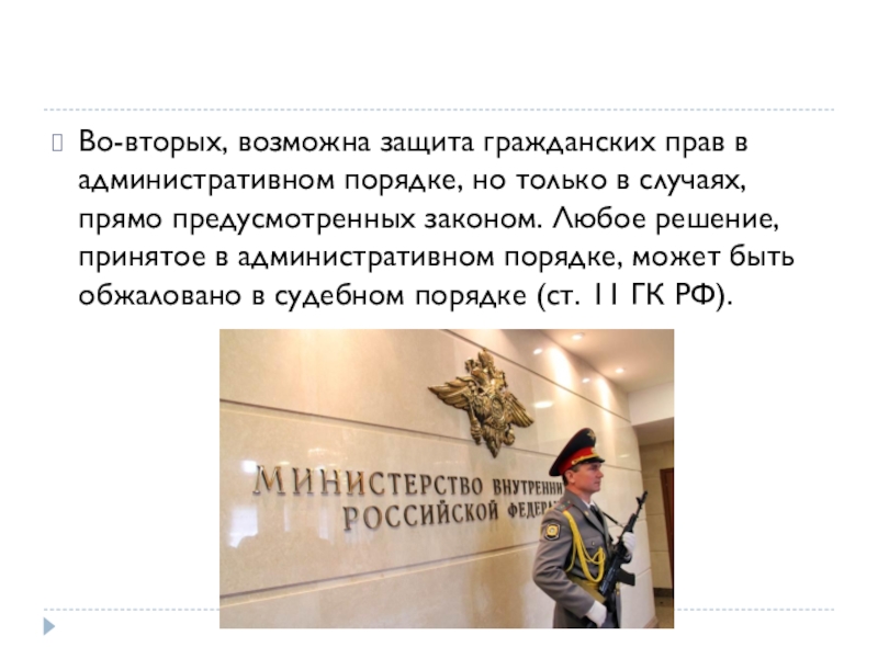 Слайд 8Во-вторых, возможна защита гражданских прав в административном порядке, но только в