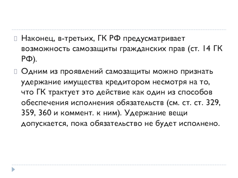 Слайд 9Наконец, в-третьих, ГК РФ предусматривает возможность самозащиты гражданских прав (ст. 14