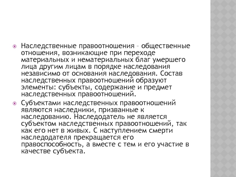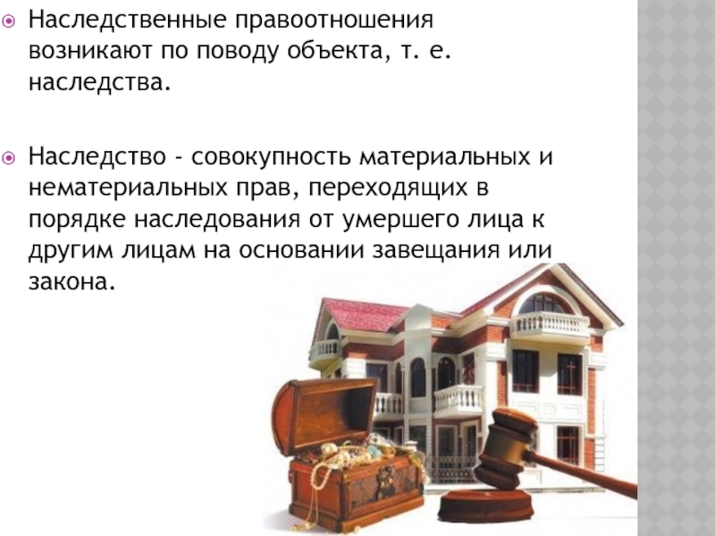 Слайд 6Наследственные правоотношения возникают по поводу объекта, т. е. наследства.