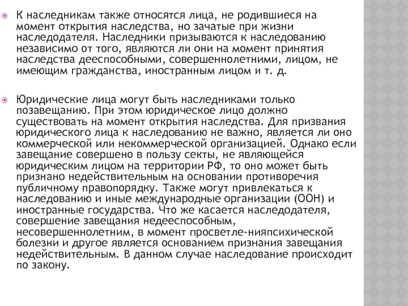 Юридические лица могут быть наследниками только позавещанию. При этом юридическое лицо должно существовать на момент открытия наследства. Для призвания юридического лица к наследованию не важно, является ли оно коммерческой или некоммерческой организацией. Однако если завещание совершено в пользу секты, не являющейся юридическим лицом на территории РФ, то оно может быть признано недействительным на основании противоречия публичному правопорядку. Также могут привлекаться к наследованию и иные международные организации (ООН) и иностранные государства. Что же касается наследодателя, совершение завещания недееспособным, несовершеннолетним, в момент просветле-нияпсихической болезни и другое является основанием признания завещания недействительным. В данном случае наследование происходит по закону.