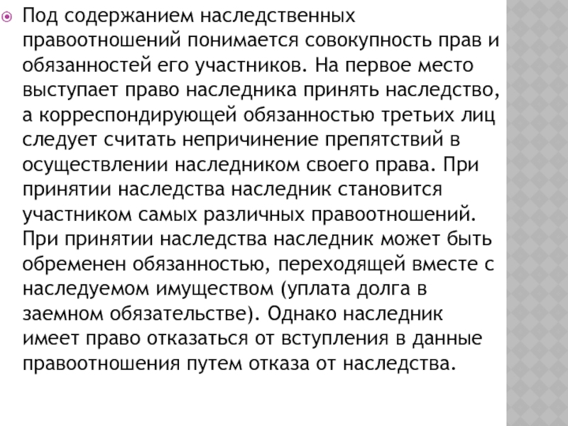 Слайд 5Под содержанием наследственных правоотношений понимается совокупность прав и обязанностей его участников.