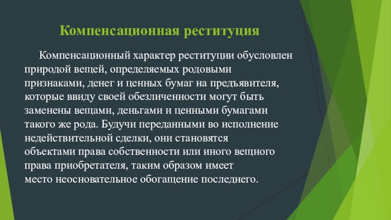 Компенсационный характер реституции обусловлен природой вещей, определяемых родовыми признаками, денег и ценных бумаг на