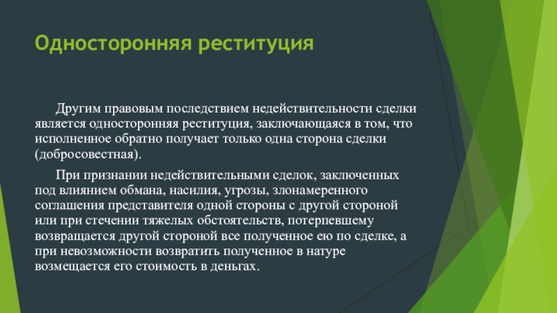 Другим правовым последствием недействительности сделки является односторонняя реституция, заключающаяся