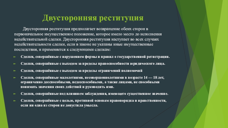 которое имело место до исполнения недействительной сделки. Двусторонняя реституция наступает во всех случаях недействительности сделки, если в законе не указаны иные имущественные последствия, и применяется к следующими сделкам: