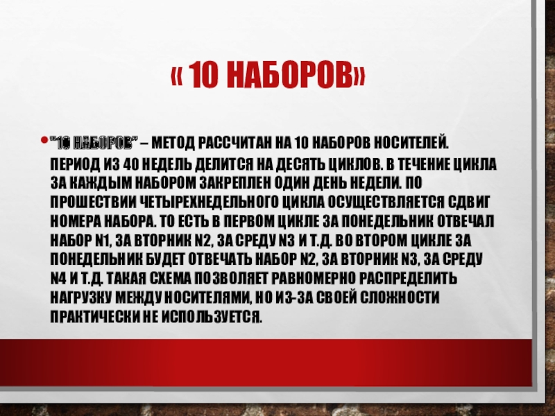 "10 наборов” – метод рассчитан на 10 наборов носителей. Период