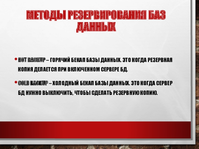 cold backup – холодный бекап базы данных. Это когда сервер БД нужно выключить, чтобы сделать резервную копию.