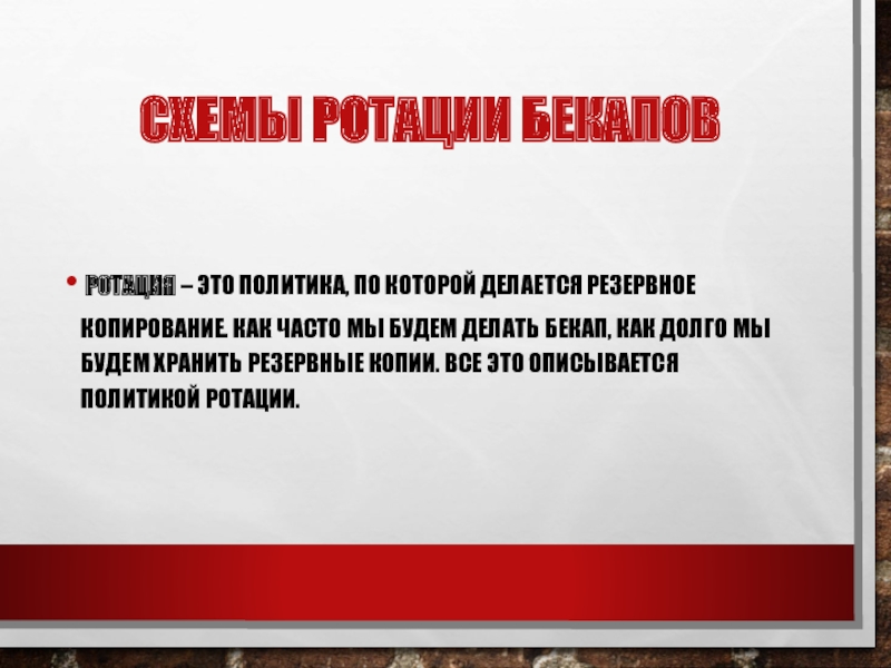 Как часто мы будем делать бекап, как долго мы будем хранить резервные копии. Все это описывается политикой ротации.