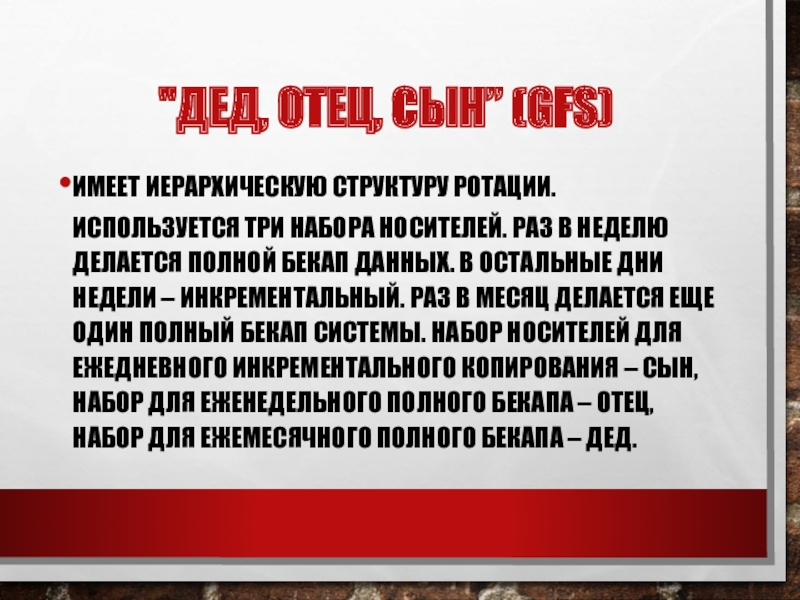 Раз в неделю делается полной бекап данных. В остальные дни недели – инкрементальный. Раз в месяц делается еще один полный бекап системы. Набор носителей для ежедневного инкрементального копирования – сын, набор для еженедельного полного бекапа – отец, набор для ежемесячного полного бекапа – дед.