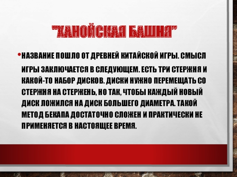 следующем. Есть три стержня и какой-то набор дисков. Диски нужно перемещать со стержня на стержень, но так, чтобы каждый новый диск ложился на диск большего диаметра. Такой метод бекапа достаточно сложен и практически не применяется в настоящее время.