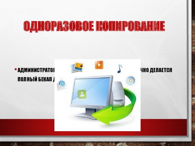администратор делает копирование вручную. Обычно делается полный бекап данных.