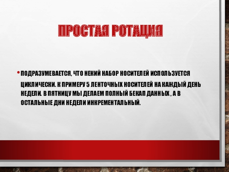 ленточных носителей на каждый день недели. В пятницу мы делаем полный бекап данных , а в остальные дни недели инкрементальный.
