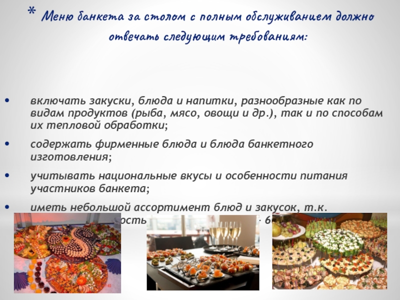 Слайд 3Меню банкета за столом с полным обслуживанием должно отвечать следующим требованиям: