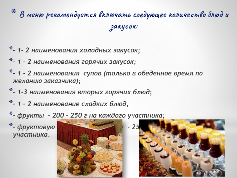 Слайд 4В меню рекомендуется включать следующее количество блюд и закусок: