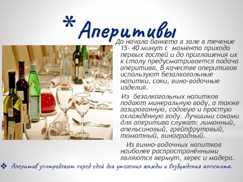 момента прихода первых гостей и до приглашения их к столу предусматривается подача аперитива. В качестве аперитивов используют безалкогольные напитки, соки, вино-водочные изделия.