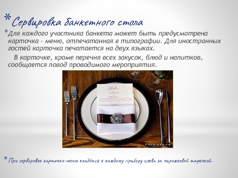 При сервировке карточка-меню кладётся к каждому прибору слева за пирожковой тарелкой.