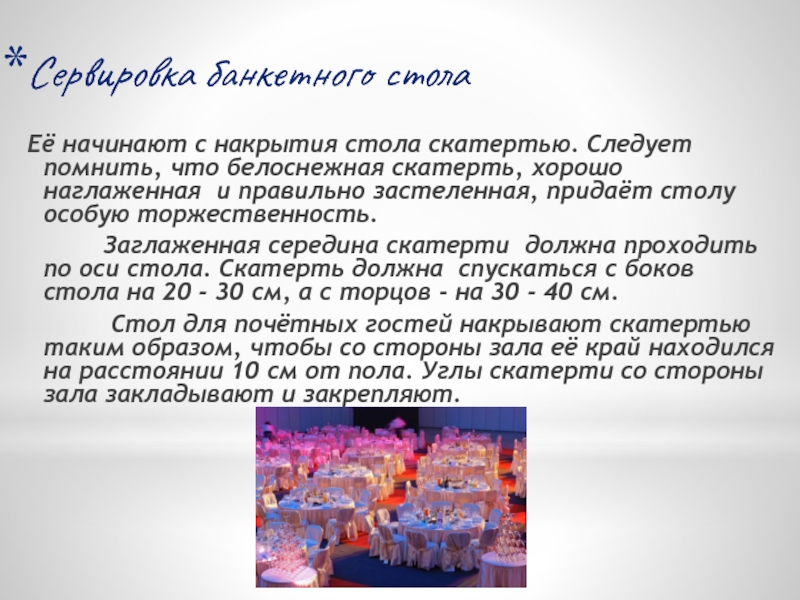 Стол для почётных гостей накрывают скатертью таким образом, чтобы со стороны зала её край находился на расстоянии 10 см от пола. Углы скатерти со стороны зала закладывают и закрепляют.