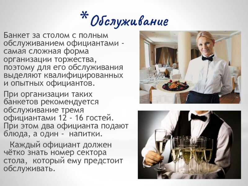 форма организации торжества, поэтому для его обслуживания выделяют квалифицированных и опытных официантов.