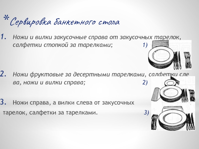 Ножи фруктовые за десертными тарелками, салфетки слева, ножи и вилки справа; 2)