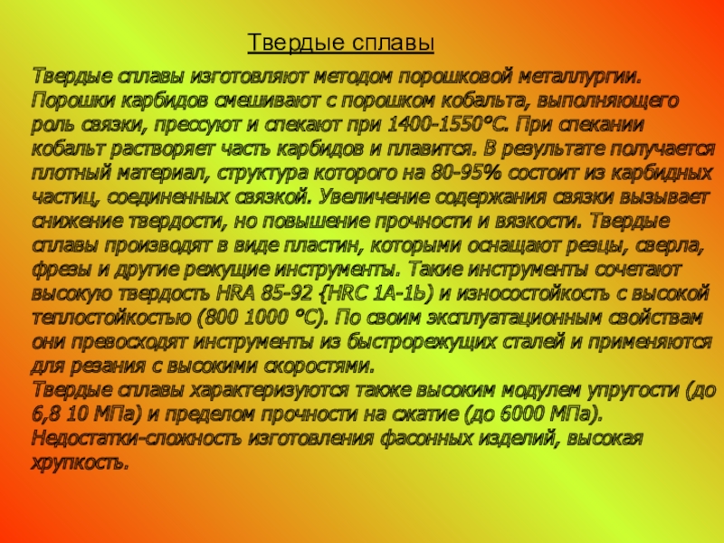 Твердые сплавы характеризуются также высоким модулем упругости (до 6,8 10 МПа) и пределом прочности на сжатие (до 6000 МПа). Недостатки-сложность изготовления фасонных изделий, высокая хрупкость.