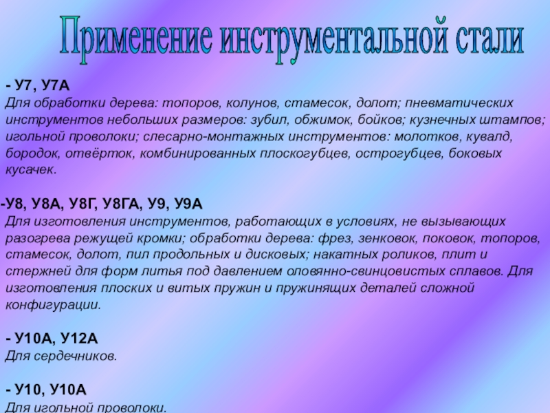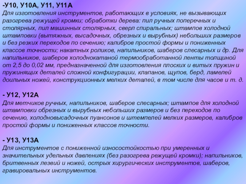 условиях, не вызывающих разогрева режущей кромки; обработки дерева: пил ручных поперечных и столярных, пил машинных столярных, сверл спиральных; штампов холодной штамповки (вытяжных, высадочных, обрезных и вырубных) небольших размеров и без резких переходов по сечению; калибров простой формы и пониженных классов точности; накатных роликов, напильников, шаберов слесарных и др. Для напильников, шаберов холоднокатаной термообработанной ленты толщиной от 2,5 до 0,02 мм, предназначенной для изготовления плоских и витых пружин и пружинящих деталей сложной конфигурации, клапанов, щупов, берд, ламелей доильных ножей, конструкционных мелких деталей, в том числе для часов и т. д.