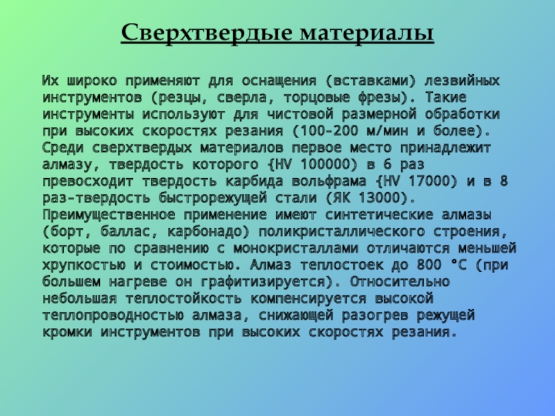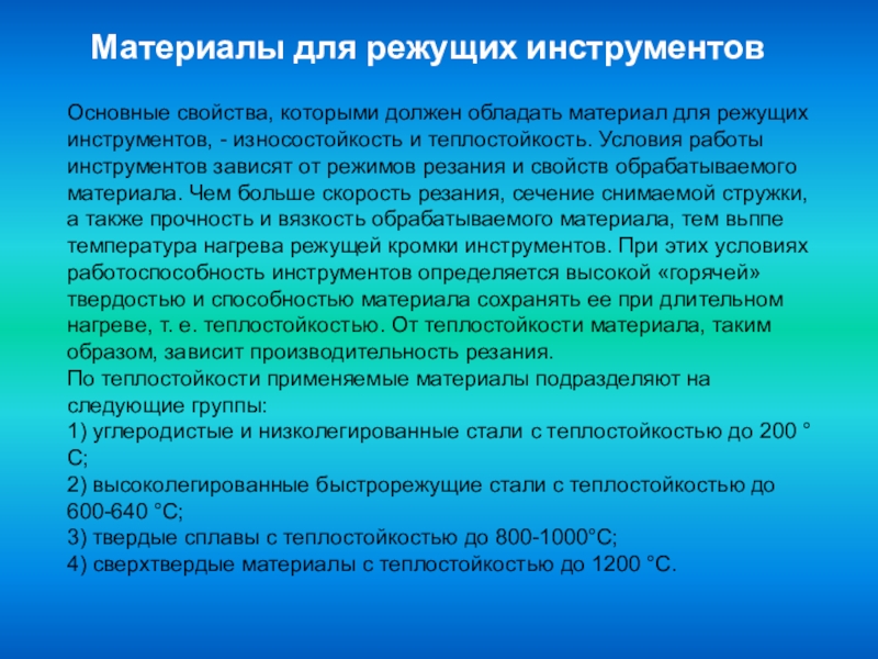 4) сверхтвердые материалы с теплостойкостью до 1200 °С.