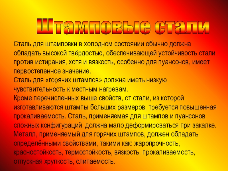 Кроме перечисленных выше свойств, от стали, из которой изготавливаются штампы больших размеров, требуется повышенная прокаливаемость. Сталь, применяемая для штампов и пуансонов сложных конфигураций, должна мало деформироваться при закалке. Металл, применяемый для горячих штампов, должен обладать определёнными свойствами, такими как: жаропрочность, красностойкость, термостойкость, вязкость, прокаливаемость, отпускная хрупкость, слипаемость.