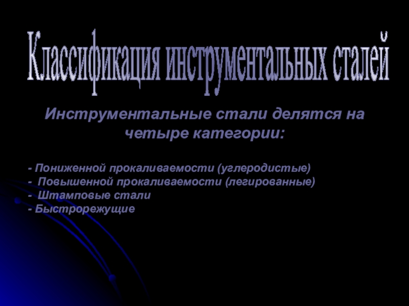 материалы - алмаз и кубический нитрид бора. Наиболее обширную и важную в практическом отношении группу составляют инструментальные стали. Они предназначены для изготовления инструментов четырех типов:
