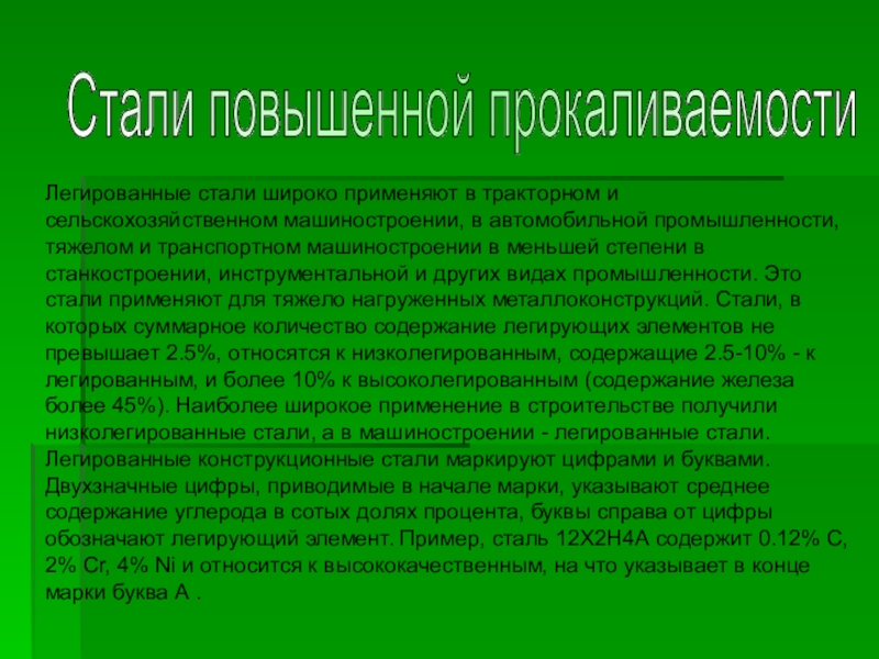 и сельскохозяйственном машиностроении, в автомобильной промышленности, тяжелом и транспортном машиностроении в меньшей степени в станкостроении, инструментальной и других видах промышленности. Это стали применяют для тяжело нагруженных металлоконструкций. Стали, в которых суммарное количество содержание легирующих элементов не превышает 2.5%, относятся к низколегированным, содержащие 2.5-10% - к легированным, и более 10% к высоколегированным (содержание железа более 45%). Наиболее широкое применение в строительстве получили низколегированные стали, а в машиностроении - легированные стали.
