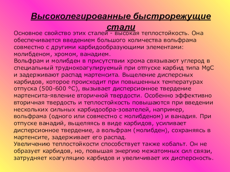 Основное свойство этих сталей - высокая теплостойкость. Она обеспечивается