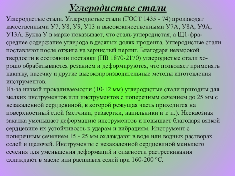 качественными У7, У8, У9, У13 и высококачественными У7А, У8А, У9А,У13А. Буква У в марке показывает, что сталь углеродистая, а Щ1-фра-среднее содержание углерода в десятых долях процента. Углеродистые стали поставляют после отжига на зернистый перлит. Благодаря невысокой твердости в состоянии поставки (НВ 1870-2170) углеродистые стали хо-