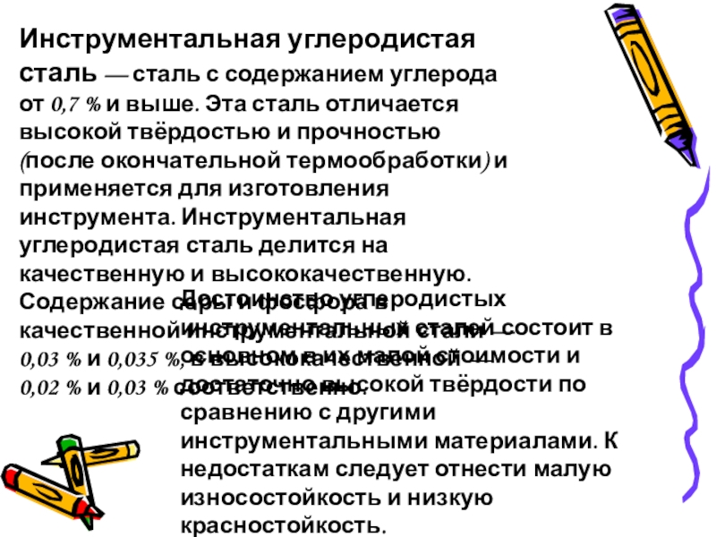 % и выше. Эта сталь отличается высокой твёрдостью и прочностью (после окончательной термообработки) и применяется для изготовления инструмента. Инструментальная углеродистая сталь делится на качественную и высококачественную. Содержание серы и фосфора в качественной инструментальной стали — 0,03 % и 0,035 %, в высококачественной — 0,02 % и 0,03 % соответственно.