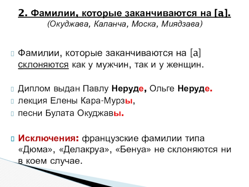 2. Фамилии, которые заканчиваются на [a]. (Окуджава, Каланча, Моска, Миядзава)