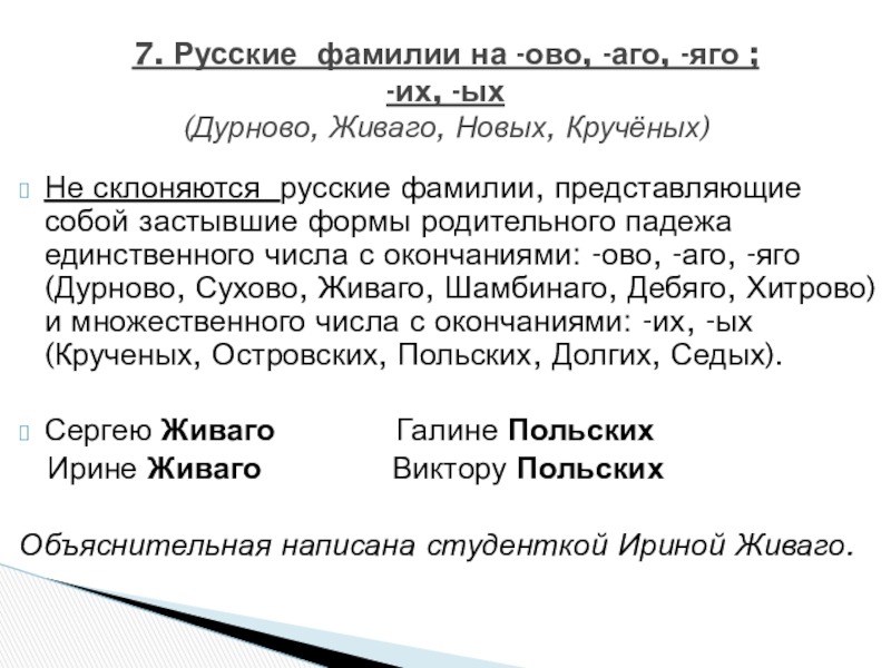 7. Русские фамилии на -ово, -аго, -яго ;