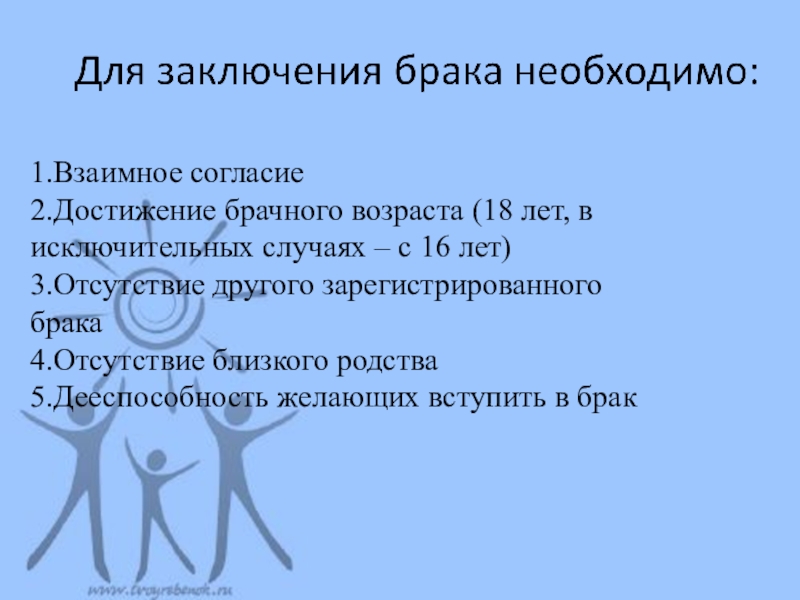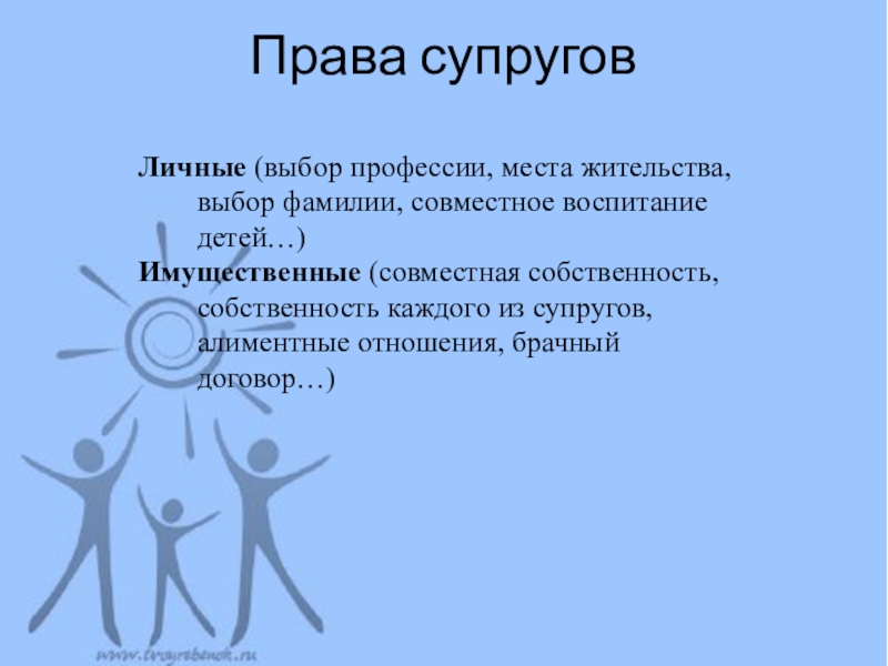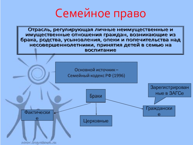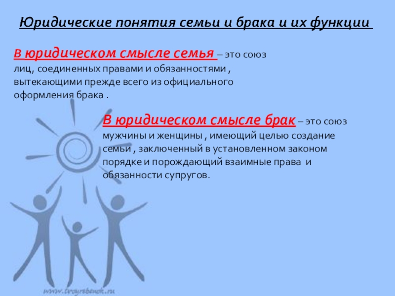 В юридическом смысле брак – это союз мужчины и женщины , имеющий целью создание семьи , заключенный в установленном законом порядке и порождающий взаимные права и обязанности супругов.