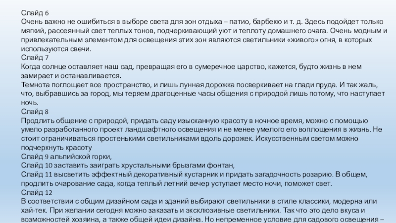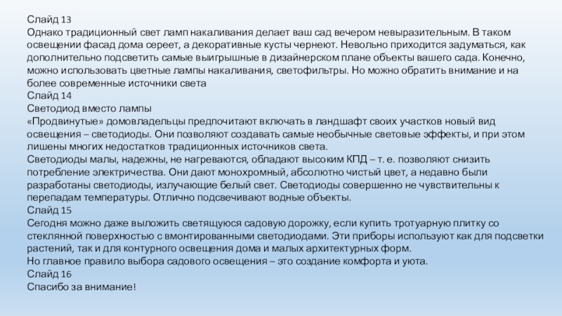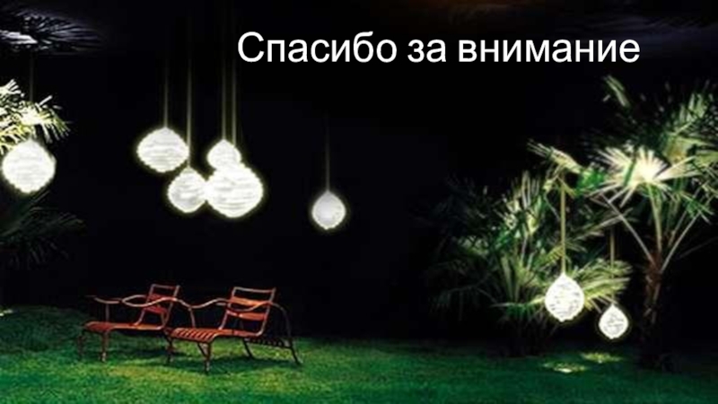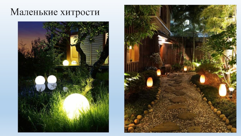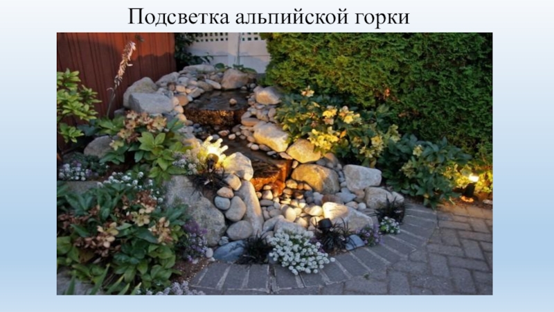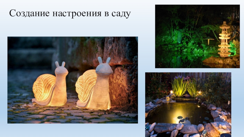 Слайд 11 высветить эффектный декоративный кустарник и придать загадочность розарию. В общем, продлить очарование сада, когда теплый летний вечер уступает место ночи, поможет свет.