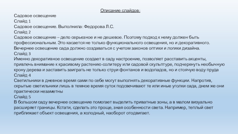 Садовое освещение. Выполнила: Федорова Л.С.