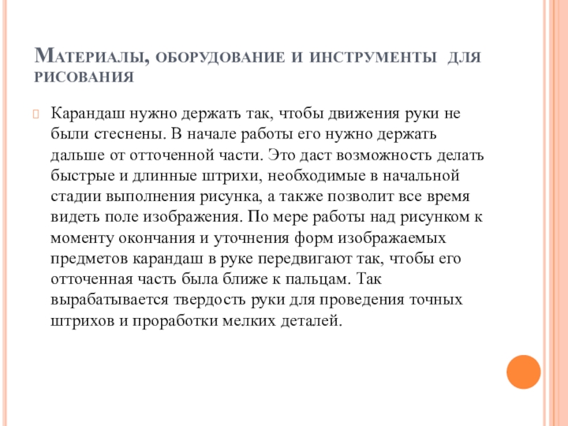 руки не были стеснены. В начале работы его нужно держать дальше от отточенной части. Это даст возможность делать быстрые и длинные штрихи, необходимые в начальной стадии выполнения рисунка, а также позволит все время видеть поле изображения. По мере работы над рисунком к моменту окончания и уточнения форм изображаемых предметов карандаш в руке передвигают так, чтобы его отточенная часть была ближе к пальцам. Так вырабатывается твердость руки для проведения точных штрихов и проработки мелких деталей.
